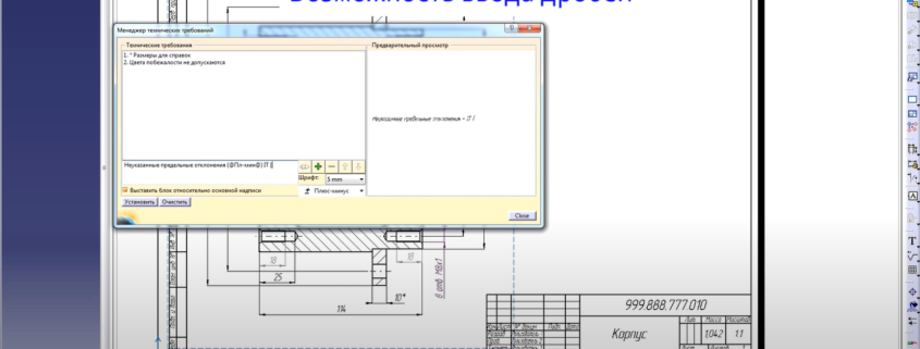 Взаимодействие осуществляется через диалоговое окно, в котором имеется окно предварительного просмотра, обновляющееся динамически и позволяющее увидеть, как выделенный элемент будет выглядеть на чертеже. Автоматическая нумерация строк при перемещении или удалении каких-либо элементов, ввод дробей, вставка спецсимволов и другие удобные функции позволят быстро создать и отредактировать блок технических требований.